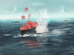 なぜか海上に浮かんだいくらの軍艦巻きが、なぜか雷撃を受けて吹っ飛んでいます。ただの駄じゃれですが、真面目なタッチの絵で描かれており実にシュール。まあ、すしも海と関わりが深いですからね。後方には、ネギトロらしき軍艦とウニらしき軍艦の姿も確認できます。
