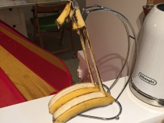 バナナ掛けに掛かった2本のバナナが熟して柔らかくなり、茎部分から重力に負けて皮がペリペリと剥けてしまいました。しかし、途中でバナナが着地したため、茎がバナナ掛けに引っ掛かったままぬーんとした状態に。実に絶妙なバランスです。