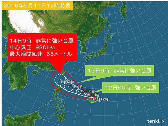 9月10日(土)午後3時、フィリピンの東の海上で発生した台風14号。この先も海水温の高い海域を西へ進み、急速に発達する見込みです。12日(月)0時には「強い台風」、13日(火)午前9時には「非常に強い台風」となり、14日(水)午前9時には中心気圧は930ヘクトパスカル。最大瞬間風速は65メートル(130ノット)の予想です。