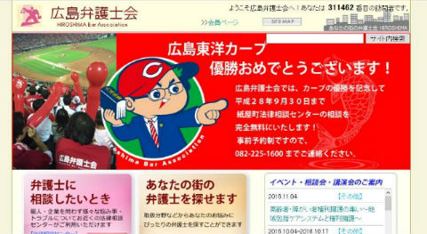 現在、広島弁護士会の公式サイトにはリーグ優勝を祝う巨大メッセージと共に相談無料の告知が掲載されています。もともと同弁護士会には熱心なカープファンが多く、公式Twitterアカウントでカープを応援したり、カープとコラボしたキャラクターを作ったり、カープの試合前にうちわを配ったり、専用のぼりを持って応援しに行ったりしていたとのこと。