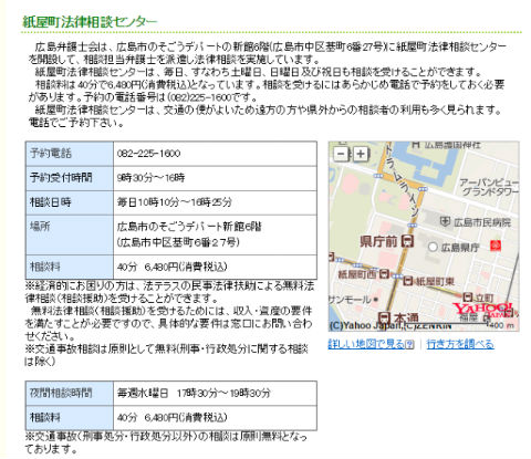 相談無料になるのは「紙屋町相談センター」のみで、電話での事前予約(082-225-1600)が必要。ちなみに通常は40分で6480円(税込)となっています。
