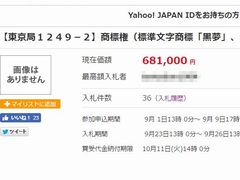 公売への参加は9日に締め切られ、9月23日13時から入札が開始。終了まで残り1時間あたりで標準文字商標「黒夢」(称呼「クロユメ、コクム」)の価格・入札件数は約10万円・10件でしたが、そこから入札が相次ぎ30分を切った時点で約40万円・25件に。最終的に68万1000円・36件となりました。落札者は4件とも同一人物です。