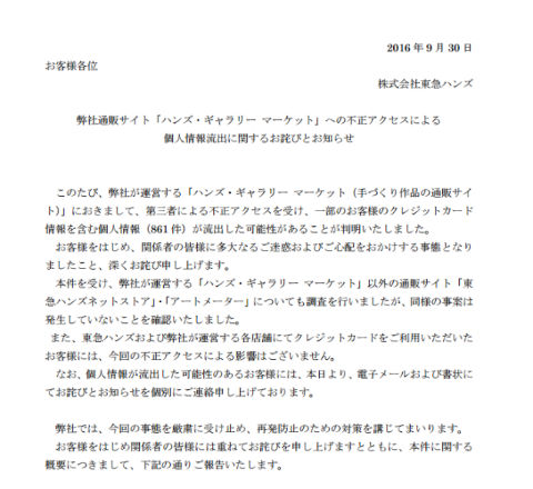 「ハンズ・ギャラリー マーケット」で861件の個人情報が流出した恐れがあります。