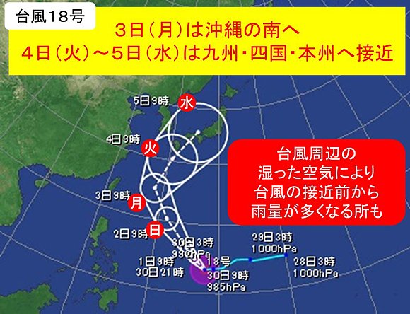 九州から関東は、台風の中心から右側(東側)にあたるため、台風周辺の湿った空気が流れ込みやすくなります。台風が近づく前の3日(月)には広く雨が降り、雨の量が多くなる所があるでしょう。台風18号は沖縄に近づいた後、進路を北東にとり、4日(火)には九州の南へ進む見込みです。さらに予報円の中心を進んだ場合、5日(水)には本州に接近し、上陸する恐れも出てきました。4日(火)から5日(水)にかけての進路については、まだ予想に幅がありますが、西日本では大荒れや大雨となる恐れがあります。また、本州付近には引き続き前線が停滞するため、前線の活動が活発になることも考えられます。このあともtenki.jpで最新の台風情報と天気予報を確認してください。