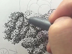 続いて葉の部分のペン入れに入ります。吉村さんは点の集合で表現する点描という手法を用いて描画するのですが、葉の部分も光源を意識して、暗くなる部分は線を増やして濃淡をつけていきます。