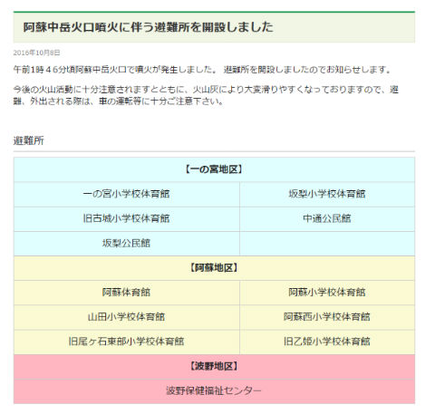 阿蘇山の中岳第一火口で、同日01時46分に爆発的噴火が発生。1キロを超える広い範囲に噴石が飛散した可能性があるとしています。火口からおよそ2キロの範囲で大きな噴石の飛散や火砕流に警戒するよう呼びかけ。また強風時には2キロの範囲を超えて小さな噴石が降るとして、風下側では注意してほしいとしています。