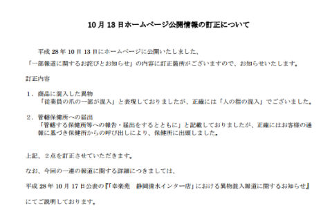 幸楽苑は10月17日、運営するラーメンチェーン店で、「提供したラーメンに爪が混入していた」とする13日の発表(関連記事)を、爪ではなく指が混入していたと訂正しました