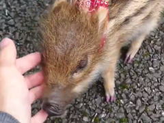 山で下痢をして死にそうなところを保護しました。獣医に検診してもらい良くなったので、イノシシ好きの担当者が飼っています。