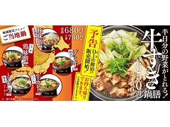 牛丼チェーン店の吉野家は11月1日の10時に「牛すき鍋膳」(並盛650円・大盛750円)および地域限定メニュー「ご当地鍋」(並盛680円・大盛780円)の販売を開始します。