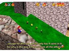 坂道に配置されたこの4枚のコインですが、動画ではなぜコインがインポッシブルコインになってしまったかにも言及。本来5枚として配置されたものの、プログラムが坂道と空中を混同し地面に埋まってしまったとされています。また、ゲーム内での坂道と平坦な道の並びが、もともとは別の1つの坂道だった可能性にも触れるなど、一連のインポッシブルコインが誕生した理由の解明にも貢献する見込み。発売から20年を迎えた「スーパーマリオ64」ですが、まだまだ研究は続くようです。