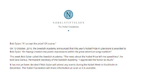 ミュージシャンのボブ・ディランさんが、ノーベル文学賞の受賞を受け入れる意向を示したことをノーベル財団が発表しました。