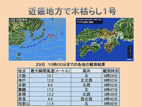 本日29日、近畿地方で「木枯らし1号」が吹きました。昨年(10月25日)より4日遅くなりました。