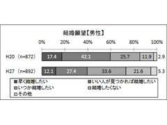 「若者の結婚観・子育て観等に関する調査」を、独立行政法人の国立青少年教育振興機構が発表しました。「結婚したくない」とする未婚者は全体で20.3%。その傾向は特に男性に強く、女性の場合は早婚を望む人と結婚したくない人が増加し、二分化しているといったデータが示されています。