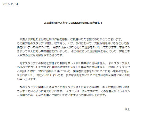 当該スタッフは支払明細や内部事情についてツイートし、その後「会社をクビになった」と投稿していました。現在アカウントは非公開になっています。P.A.WORKSはこの件について本人に事実確認と面談結果行ったとし、その際に当該スタッフからSNS投稿について関係者に迷惑をかけたことへの謝罪があったと報告しています。また同社から当該スタッフに契約の解除を申し入れた事実はなく、また当該スタッフのSNSアカウントについて削除の依頼や指示をした事実もないと述べています。