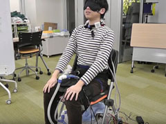 腹巻き型や椅子型のデバイス、ネッククッションで、膀胱の圧迫や排尿の暖かさ、体温低下など失禁時に起こる現象を再現するVR装置。当初は「若い人たちにも老人体験をしてほしい」という思いの下、学園祭に向けて小規模に開発されました。