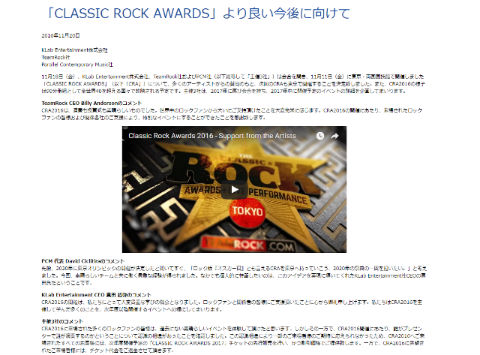 主催のKLab Entertainment、TeamRock、PCMは、「誰がプレゼンターで誰が演奏するのかということについて認識の相違があった」ことを確認したと報告。CRA2016に失望した来場者にはチケット代金を返金するとしています。またCRA2016来場者すべてに、来年開催の「CLASSIC ROCK AWARDS 2017」のチケットを割引価格で先行販売することも明らかに。返金や次回の優待についてはWebサイトで問い合わせ窓口を案内しています。