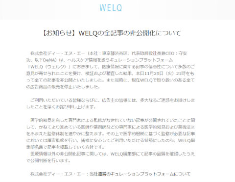 WELQは掲載内容について、内容の不正確さなどの問題が指摘され、全記事を非公開に(関連記事)。DeNAは医学の専門家によって執筆された記事は一部だったことを認めています。またWELQ以外のDeNAのキュレーションサイトについても、他サイトからの転用などが指摘されていました。