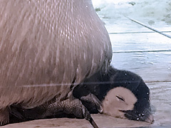 日本に1羽しかいないコウテイペンギンの赤ちゃん、親ペンギンのおなかの下ですくすく成長中