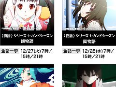 「アニメ24チャンネル」では、映画「傷物語」完結編の公開が2017年1月に迫った「〈物語〉シリーズ」の、1作目「化物語」〜「終物語」までの全77話を12月24日から一挙放送。さらに「君の名は。」の新海誠監督作品「秒速5センチメートル」「言の葉の庭」「雲のむこう、約束の場所」を12月31日から年越しで一挙放送します。