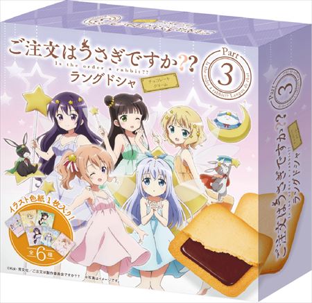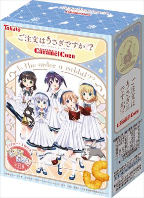 12月20日から「ご注文はうさぎですか??」クリアカード1枚入りキャラメルコーン(300円)と、イラスト色紙1枚入り「ラングドシャ3 チョコレートクリーム」(600円)を数量限定で販売します。