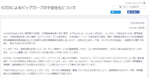 KDDIは12月8日、インターネット接続サービスを提供する「ビッグローブ」の子会社化を発表しました。2017年1月末を目途に完全子会社化する予定で、買収額は約800億円。