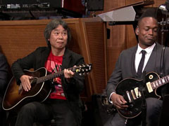 ゲストのヒップホップグループ、ザ・ルーツのメンバーと並び、ギターを抱えて参加。地上面のテーマを弾き終えると、最後のミス音に合わせてギターをたたき、ちょっとおどけてみせました。