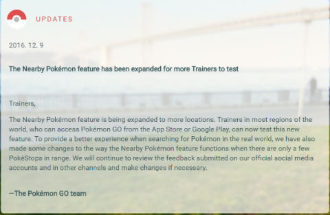 「Pokemon GO」(ポケモンGO)運営元は12月9日(米国時間)、「近くにいるポケモン(Nearby Pokemon)」機能のテストを世界各地に拡大すると発表しました。