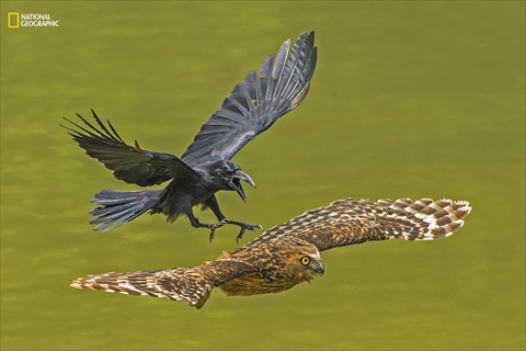 選外佳作「Crow chasing Puffy Owl」Lawrence Chia Boon Oo/2016 National Geographic Nature Photographer of the Year