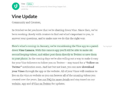 既に公開されたVine動画は引き続きvine.coのサイトで閲覧可能。さらにVineの動画をアプリまたはWebサイトからダウンロードできるようにもなったとしています。