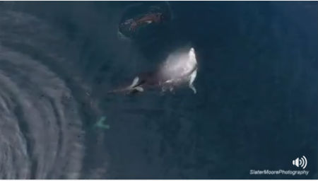 シャチがサメを食べる光景をドローンで上空からとらえた珍しい映像が海外で話題になっています。