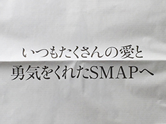 「いつもたくさんの愛と勇気をくれたSMAPへ」と書かれた1面広告から始まったページには「強く強く 未来を信じて」「ココカラ 手を繋ごう」「私たちはその手を離しません」「これからも私たちはそばにいます」「We Love SMAP Forever」「Can't Stop!! -Loving-」というメッセージと共に、1口3000円という形で支援した支援者らの名前を掲載しました。