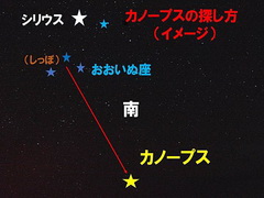 明るさはマイナス0.7等級、全天ではシリウス(おおいぬ座α星)に次いで二番目の明るさを誇っています。ただ、日本から見ると南の空低く、観測条件・気象条件が整わないと観察が難しい星となっています。めったに見えないため、古来、「南極老人星」「寿老人」などといわれ、見えれば長生きができるおめでたい星とされてきました。一方、探し方としてはそれほど難しくはありません。全天一の明るさのシリウスを擁するおおいぬ座のしっぽから斜め右下方向、地平線すれすれに赤味がかった星が見つかれば、それがカノープスです。