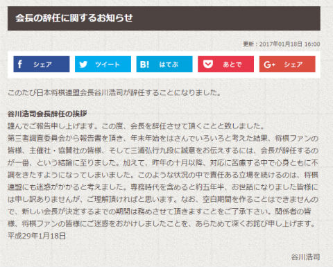 日本将棋連盟は1月18日、谷川浩司会長の辞任を発表しました
