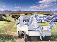 PRイラストには、まおうさんの「初雪のキセツ」が選ばれました。こちらは、北海道の自然の中で雪ミクさんがトラックの荷台に座り、青空を見上げているイラスト。「雄大な自然の中をしっかりと大地に根を張って前へ前へと進んでいく」という、この企画のコンセプトが表現されていることが評価されました。