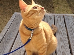 普段は家の中で暮らす猫たちですが、時々は庭で遊びます。ひろしはリードを付けてもらってお庭デビュー。植物や風の匂い、ご近所のワンちゃんの声など気になるものがいっぱいです。一緒にいるのは先輩猫のクロ。お庭での作法を教わっているのかな?