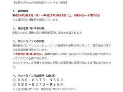 ホットラインは2月25日までの9時から17時の間に開設。ホットラインでは、コンベンションビューローの職員が宿泊施設に関する空室情報の提供を行いますが、予約の代行は行わないとのこと。各宿泊施設への予約は相談者自身で行う必要があるので注意が必要です。