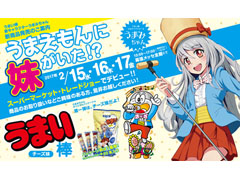 2月15日〜17日開催の食品業界向け展示会「スーパーマーケット・トレードショー」で初お披露目。4月ごろから、うまみちゃんデザインの「うまい棒 チーズ味」(30本入り大袋)が、アミューズメント施設などで順次展開される予定です。