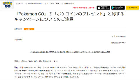 「Pokemon GO(ポケモンGO)」運営元が、「ポケコインをプレゼントする」としてSNSなどで拡散しているキャンペーンについて、公式のキャンペーンではなく、無断で行われているとして注意を促しています。