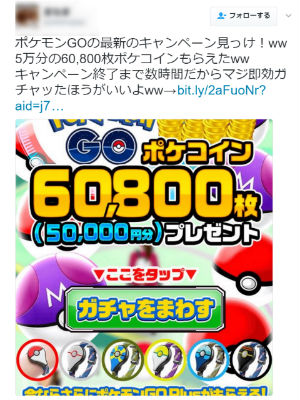 問題のキャンペーンは、ポケモンGOのロゴなどを使い、ゲーム内通貨「ポケコイン」をプレゼントする、無料配布するなどとうたっています。これに対してポケモンGO運営元は「一切関係ない」「ロゴやデザインの使用も許諾していない」と関連を否定。「これらのキャンペーンを行っている事業者に対する法的措置を含め、調査・検討を進めております」と対処する意向を示しています。