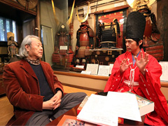 この日、私は取材班の発案で直垂での取材となっていた。井伊家のイメージに合わせた赤い直垂である。当初畏まって正座をしながらの取材であったが、話し込んでいるうちに撮影を担当していたカメラマンもいなくなり、足を崩すことにした。