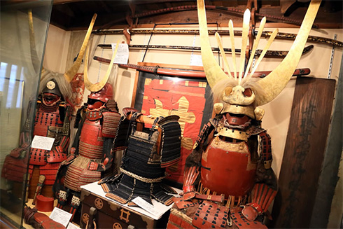 部屋の片側には、井伊家伝来の赤備え甲冑(朱塗桶側腰菱綴二枚胴具足)や木俣守安の馬印(鳥毛の棒)などの逸品が展示されている。
