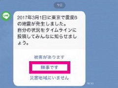 今回のサービスはこれまでよりも簡単に自分の無事を知らせ、家族や友人など大事な人たちの安否が確認できるというもの。大規模な災害発生時に、災害が発生した国のアカウントを保持しているユーザー全員を対象に、「LINE」の公式アカウントのトーク上に「被害があります」「無事です」「災害地域にいません」という3つのボタンが表示される。いずれかを選択すると、LINEのタイムライン上で友人に無事や被害状況を知らせることができる。本機能は、AndroidおよびiOSアプリからご利用可能だ。
