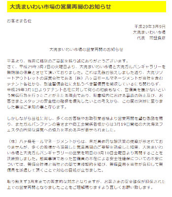 同社は7日、リゾートアウトレット大洗の運営元・八ヶ岳モールマネージメントに背信行為があったとして無期限休業を発表(関連記事)。しかし多くの客や取引先から営業再開を望む声があったこと、ガルパンファンや商工会関係者から19日開催の大洗海楽フェスタの円滑な運営への協力を求める声が寄せられたことを受けて再開を決めたとしています。