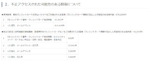 ソフトの脆弱性を悪用した不正アクセスにより、都税クレジットカード支払サイトと住宅金融支援機構の団体信用生命保険特約料クレジットカード支払いサイトに悪意あるプログラムが仕込まれたことが判明。前者では約67万件、後者では約4万3000件の個人情報が流出した可能性がある。流出の可能性があるのはクレジットカード番号、メールアドレス、氏名、住所など。
