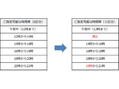 6月中に、「12時から14時」の時間帯指定が廃止されます。また、「20時から21時」の時間帯指定を廃止し、「19時から21時」の時間帯指定を新設するとのこと。