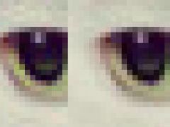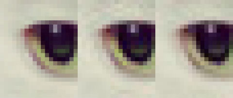 猫の目のズーム画像。左が圧縮していないオリジナル、真ん中がlibjpeg、右がGuetzli