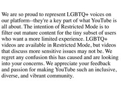 これを受けてYouTubeは「当社のプラットフォーム上でLGBTQ+が議論されるのは誇りに思っており、それらはYouTubeが大切にしていることの一部である」と説明。制限モードの仕様については、「LGBTQ+関連の動画は制限モード下でも再生できるが、一部のデリケートな問題を扱うものはそうでないかもしれない」と非を認めた。そして「混乱を招いたことを後悔し、懸念される事象について検討している」と、仕様の修正を示唆している。
