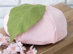 「桜餅ぼうし」の表側は淡いピンク色のフェルト。丸いフォルムの帽子に桜の葉をかたどった緑のモチーフがついており、裏側には和柄・麻の葉の風呂敷布を使っています。
