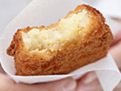 「カルビーポテトコロッケ」には、熟成させて甘みが増した品種「北海こがね」を使用。サクサク感のある小判型のコロッケで、旨みだしを入れた“プレーン”(120円)と“北海道発酵バター”(150円)の2種類を用意。パン粉も新鮮でかつ北海道産100%にこだわり、店頭では冷凍保存したものを使用日に解凍して揚げて販売します。