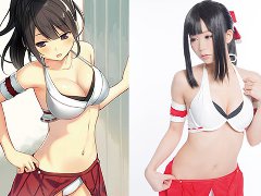 モデルを担当したのは人気コスプレイヤーの「五木あきら」さん。元のイラストとおそろいの髪型にしていますが、巫女風なだけに黒髪のポニーテールがすばらしくマッチしています。かわいい。